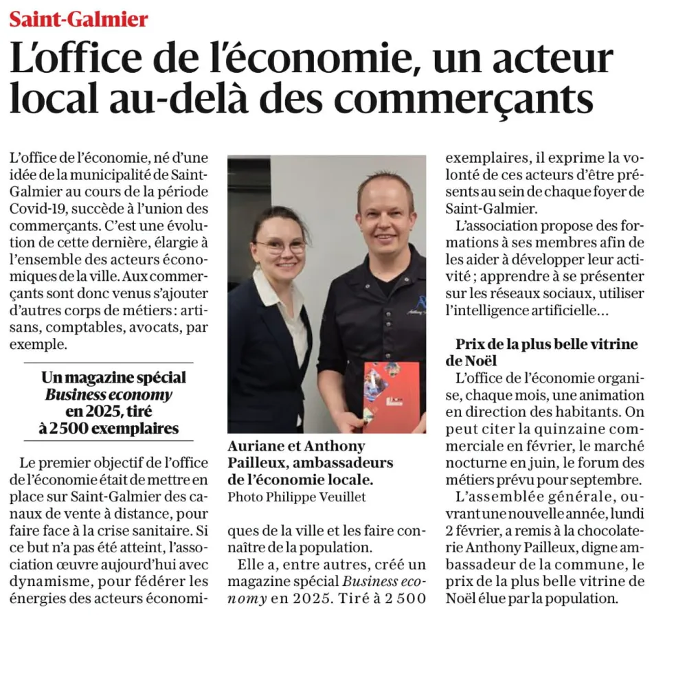 Lors de l'assemblée générale de l'économie qui s'est tenue le 2 février, nous avons eu l'honneur de recevoir ce prix, et nous tenons à exprimer notre gratitude envers tous ceux qui ont voté pour nous. Un grand merci également à l'office de l'économie pour l'organisation de cet événement, et au casino Partouche de Saint-Galmier pour sa générosité.