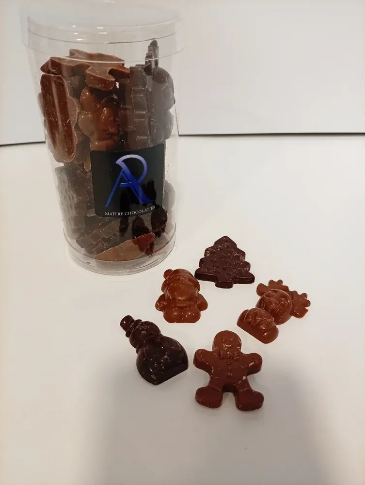 - Père Noël en chocolat : lait ou noir garni de Pavé Baldomériens: praliné, éclats de noisettes grillées enrobés de cacao en poudre.