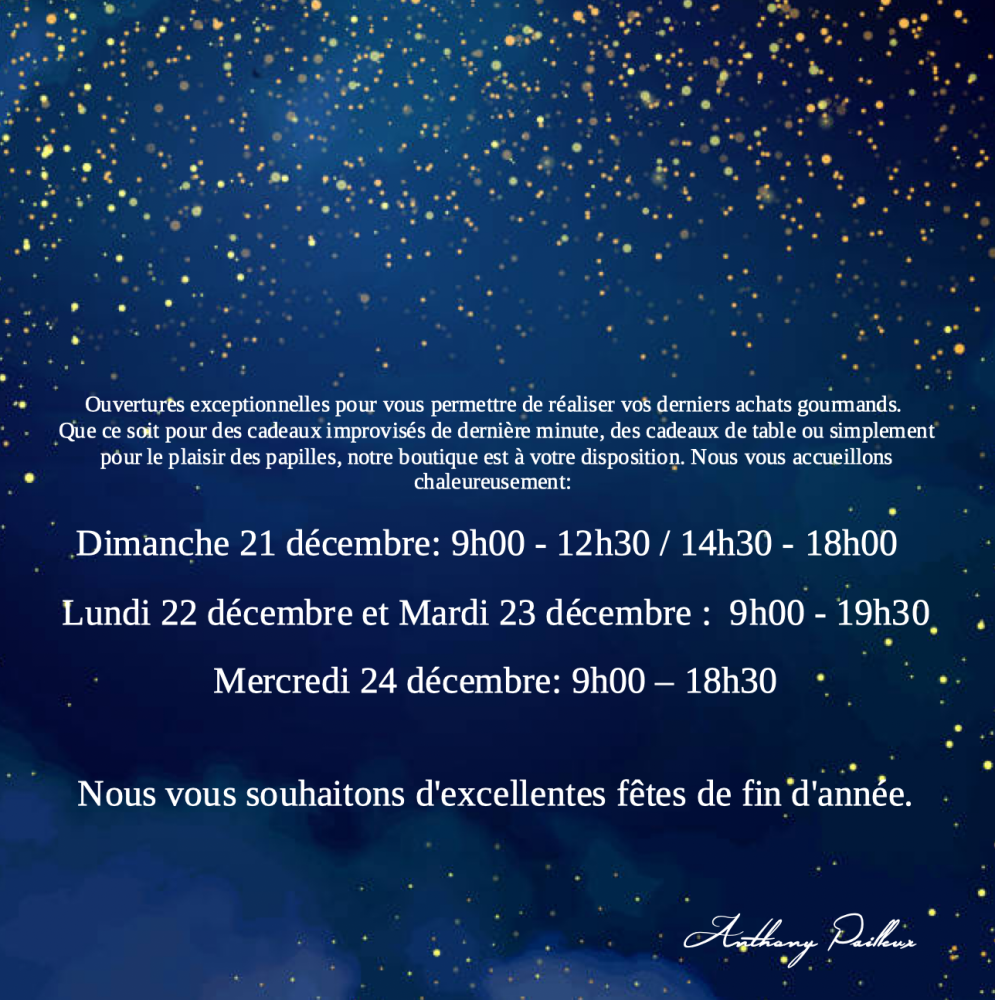 Maître Chocolatier Anthony Pailleux est ravi de vous annoncer ces ouvertures exceptionnelles pour vous permettre de réaliser vos derniers achats gourmands. Que ce soit pour des cadeaux improvisés de dernière minute, des cadeaux de table, un secret Santa ou simplement pour le plaisir des papilles, notre boutique est à votre disposition. Nous vous accueillons chaleureusement: